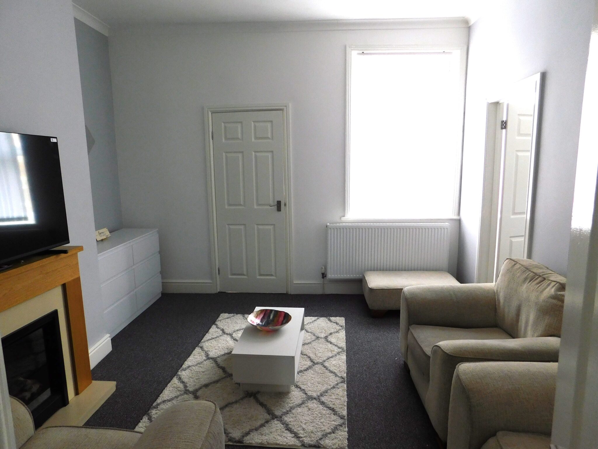 Briefly comprising, a good sized lounge with sofas, electric fire, TV, and drawers. The kitchen includes white goods, plenty of storage space with a range of wall and floor units and tiled splash back. There are 2 double bedrooms, 1 with bed and wardrobe, the second with wardrobe and dryer. The third bedroom is unfurnished. The bathroom has shower over the bath. There is a shared yard and on street parking.